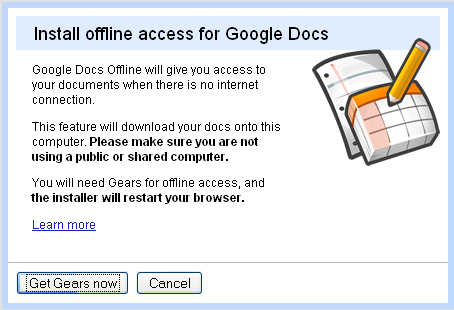 If you don’t have an internet connection, Google Docs is available offline using Google Gears. Simply click the Offline link at the top of Google Docs, install Google Gears, and you will be able to access your documents offline. There are a few limitations, however: word processing documents can be viewed and edited offline, but spreadsheets and presentations will be read-only. Obviously, group collaboration and sharing features are unavailable offline as well.