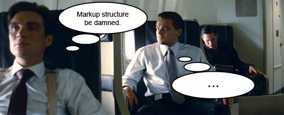 Let’s have an honest discussion about HTML markup and Javascript. As CSS became a dominant force in shaping the appearance of valid HTML in the 2004 and on, it became more important to structure markup in a meaningful way. Using tables for layout has gone the way of the dinosaurs, DIV overload is now taboo, and designers are utilizing more intelligent information structure in their markup. Somewhere in all this sanity, jQuery has made us a little bit crazy.